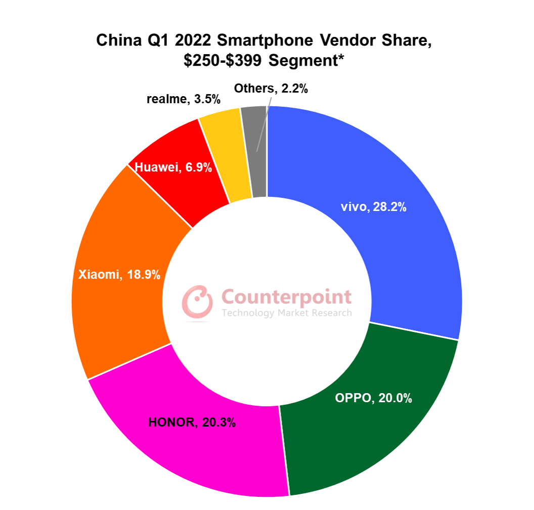 依据 Counterpoint 的我国手机类型出售数据追寻陈述显现:2022年Q1在250-399美元(按批发商价格计算)价位的手机细分商场中, vivo 以 28.2% 的比例抢先商场。在该中高端商场的 145 款机型中,vivo 的 S12 出售量位居第一,占总销量的近 9%。紧随其后的是机型有Redmi K40、HONOR 60、OPPO A93s和Huawei Nova 9。